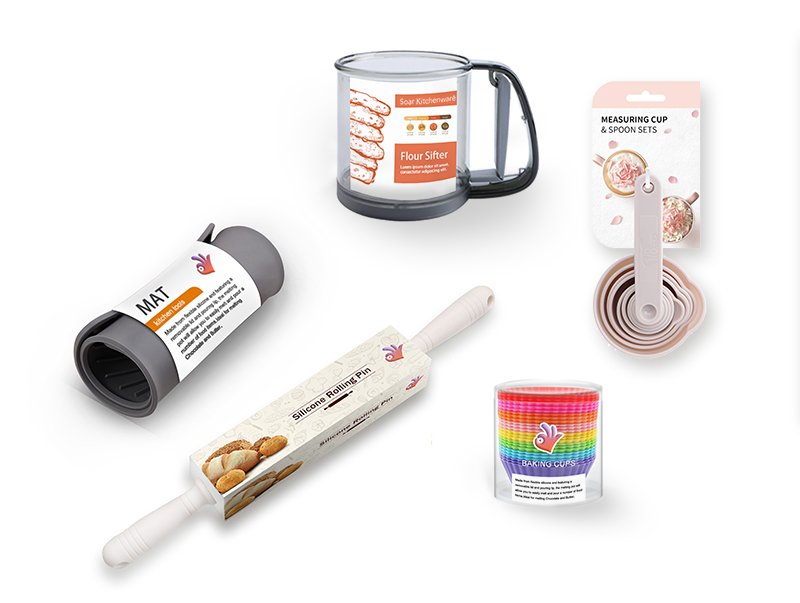 There are various types of packaging for kitchenware. The common packaging types include stickers, printing polybags, head cards, hangtags, backcards, color boxes, PVC boxes, single-sided or double-sided blisters, and display boxes.